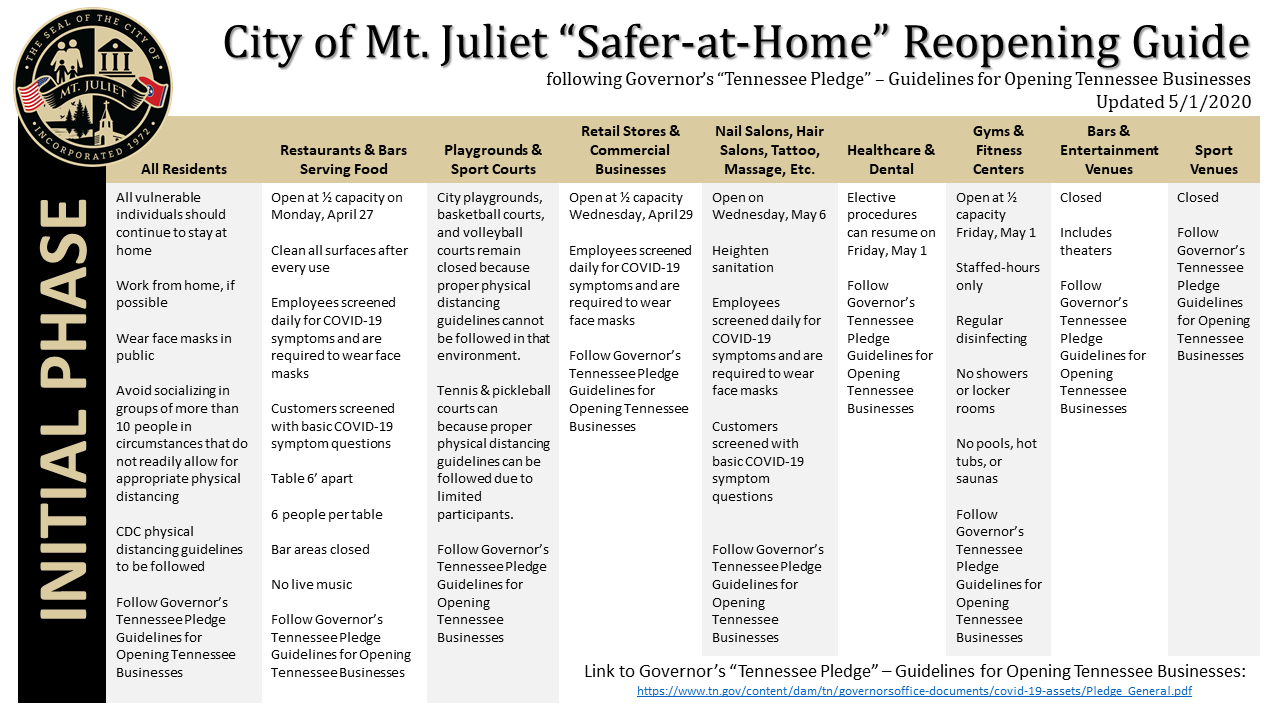 Mt. Juliet Safer-at-Home Reopening Guide - Initial Phase 04242020